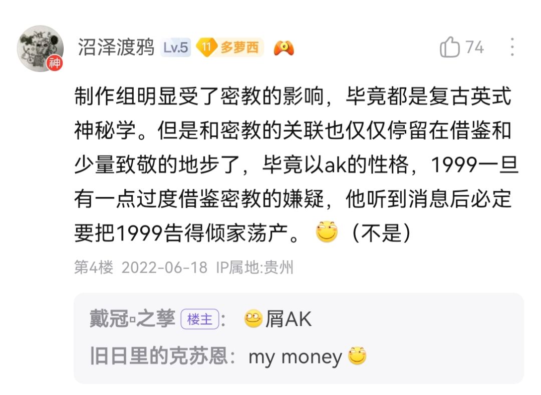 AK在神秘学深耕多年,密教里肯定有很多有趣的东西。拿出来、展示出来,喜欢1999的很多也是对神秘学有兴趣的玩家,本来这就是密教扩圈的一次机会。