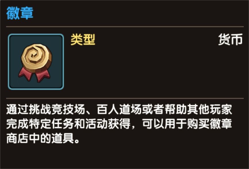 徽章可以用于购买徽章商店中的道具,里面有宠物改造石、装备改造石、符文改造石、舞王秘诀等道具。获取途径:百人道场(单人/组队)、帮助其他驯兽师完成特定任务或活动。