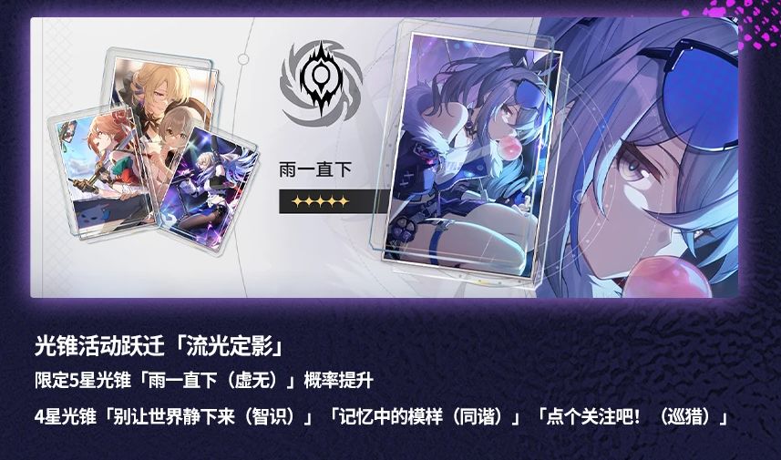 星穹铁道官方公布了1.1版本第一期的光锥前瞻,也就是银狼同期光锥卡池以及活动赠送光锥的详细属性。银狼卡池光锥为:银狼专属五星光锥“雨一直下”、巡猎光锥“点个关注吧”、同谐光锥“记忆中的模样”以及智识光锥“别让世界静下来”。先来看看各自的属性:
