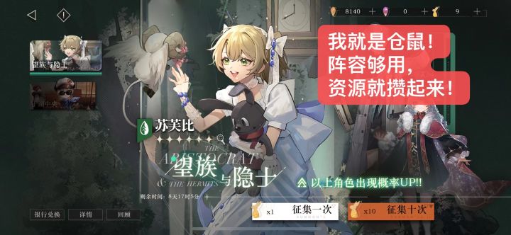 不要抽望族于隐士,不然根据规则5星大概率出夏利和X。至于苏芙比,您人品都给红弩箭了,30抽都没有一个5星奶,不怕70保底才出?而且个人认为:气球比苏芙比好用。