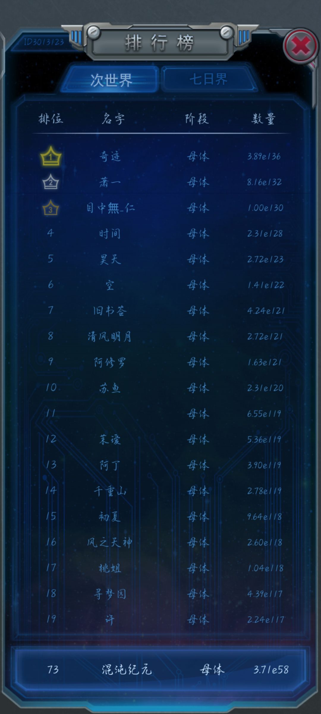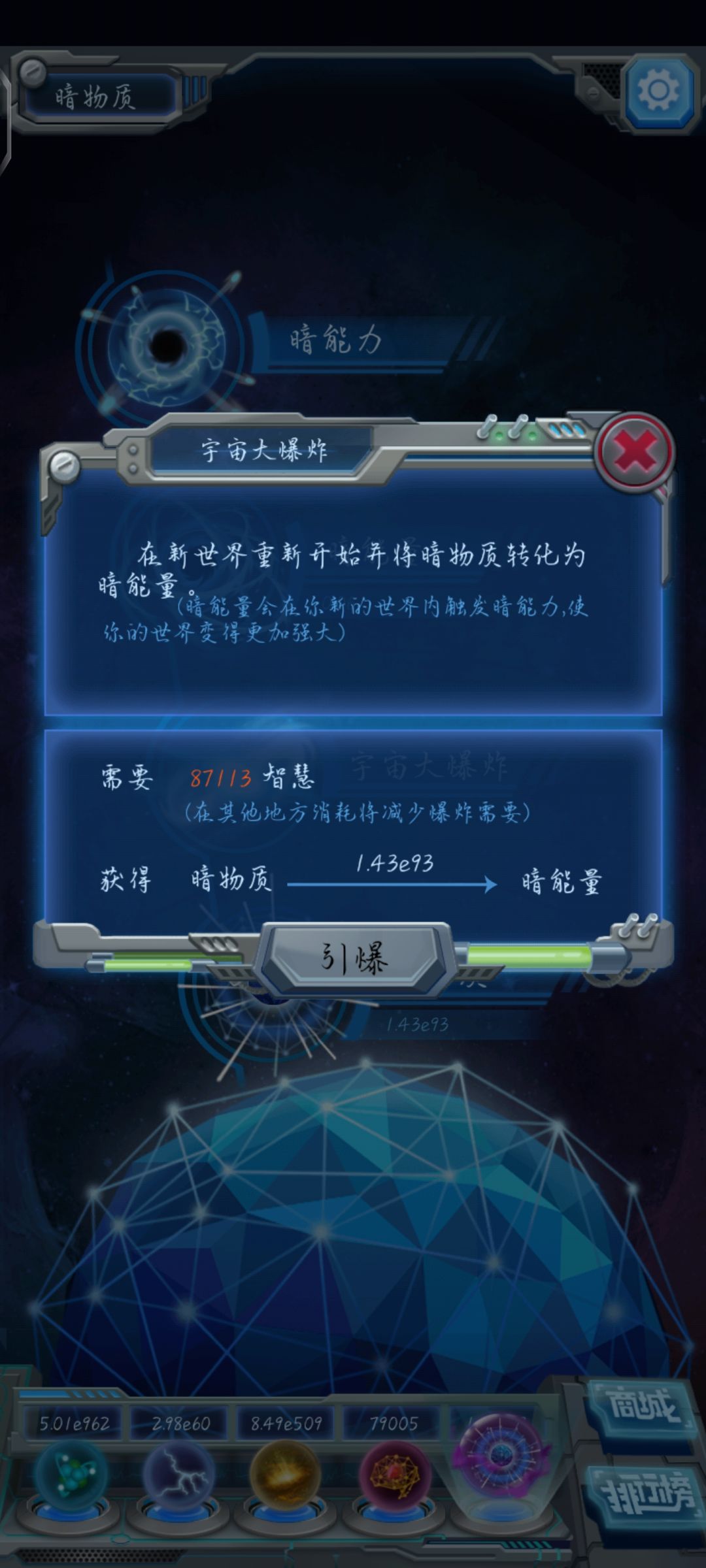 我逛论坛的时候看到MOBS大佬在别的帖子回复过不冲榜的话二炸暗物质到E104左右就可以二炸了,但是冲榜没太大希望。另外,最多只能爆炸19次,也就是说前面爆炸的积累是后面更高数据的基础。