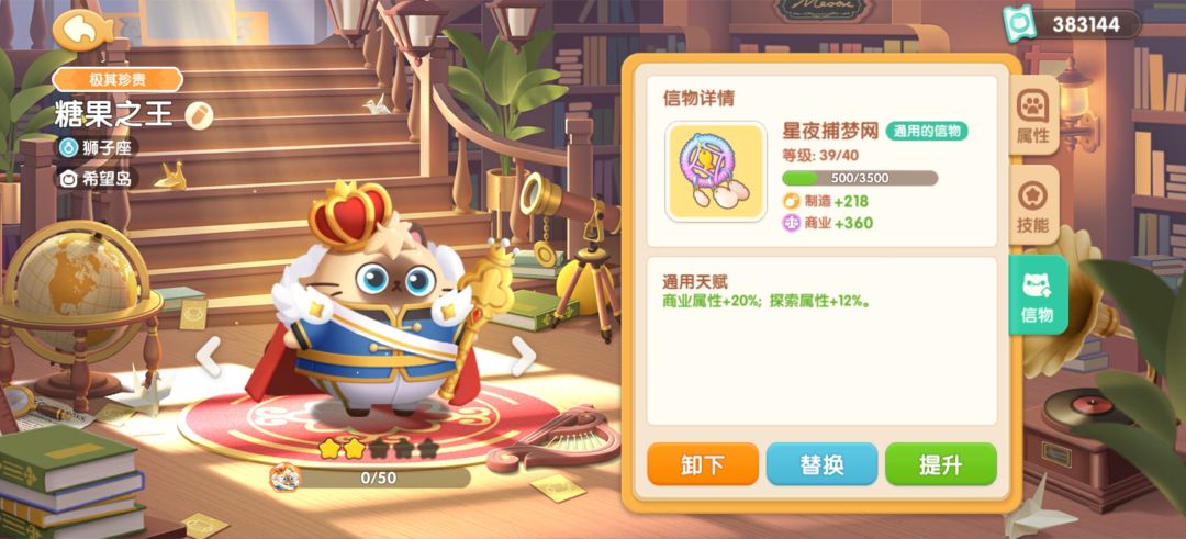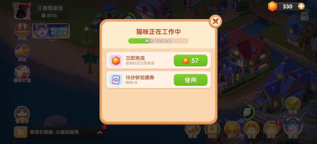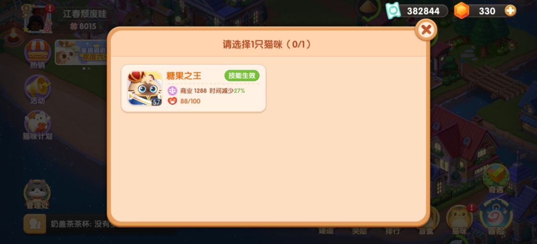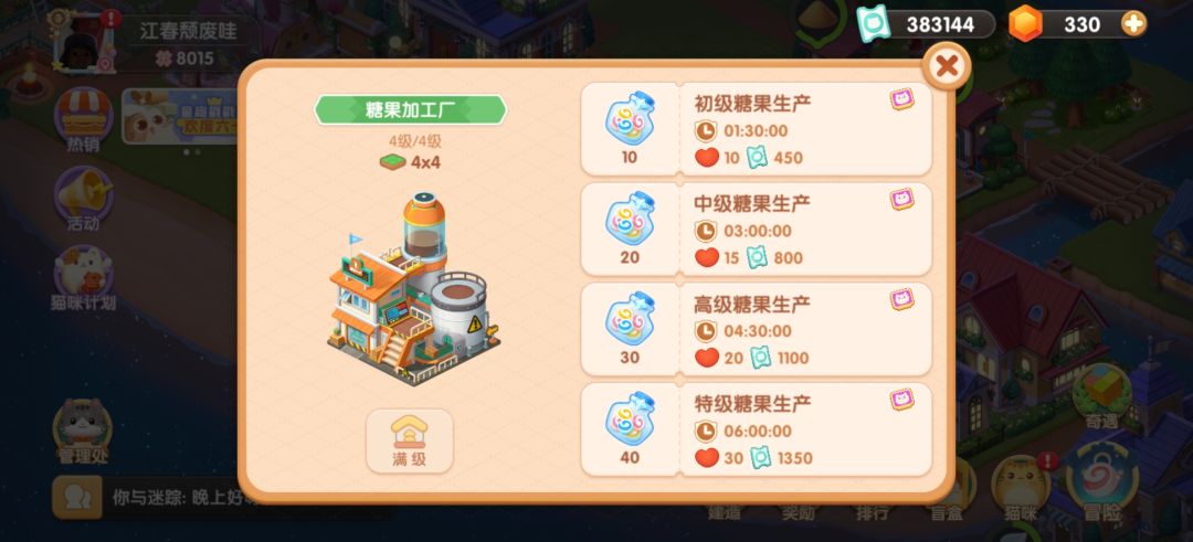然后选择第一个初级糖果生产。因为最下面六小时的不仅要四只猫,而且加上罗德里的技能也只能生产2800经验。而选第一个,配合罗德里的技能相当于一个半小时不到生产1400经验,而且剩下三只猫可以干别的工作。