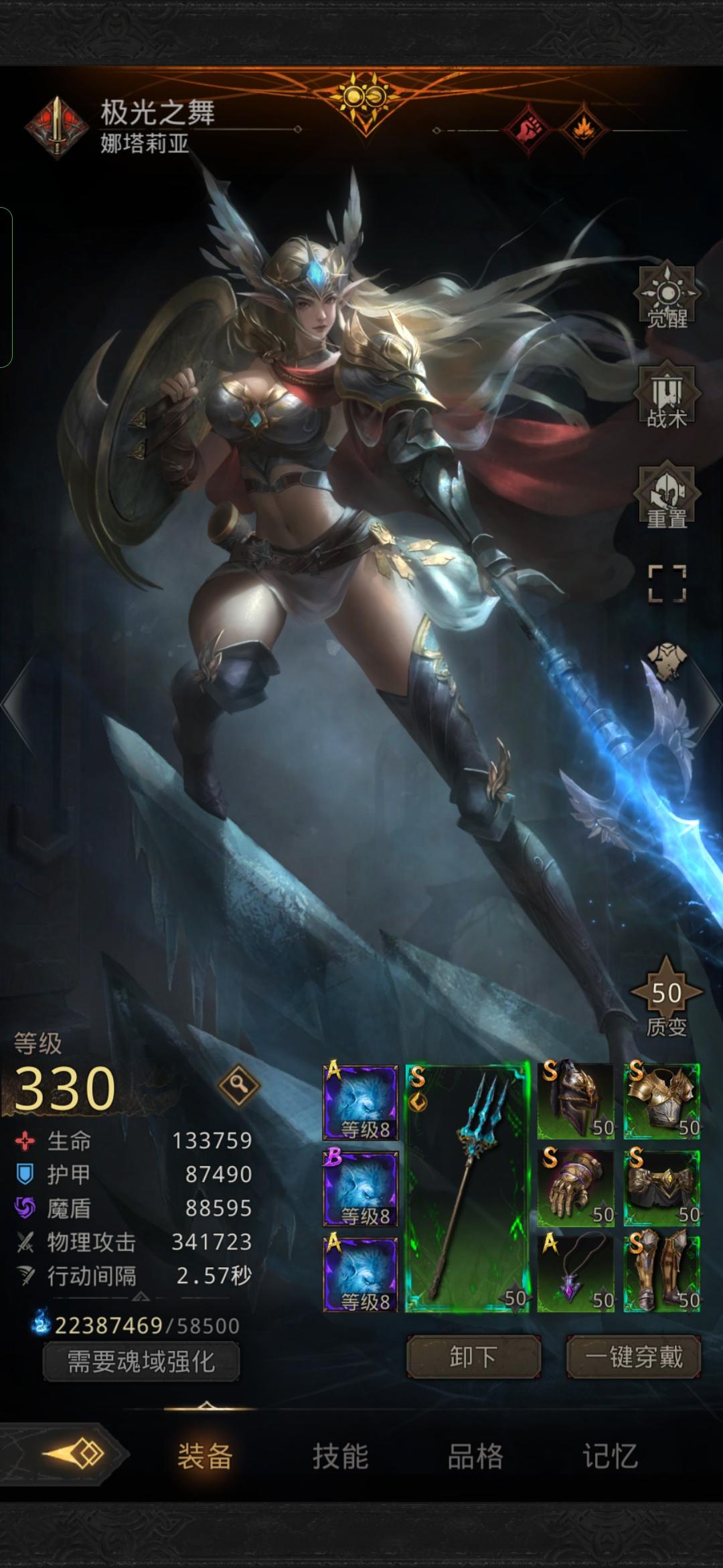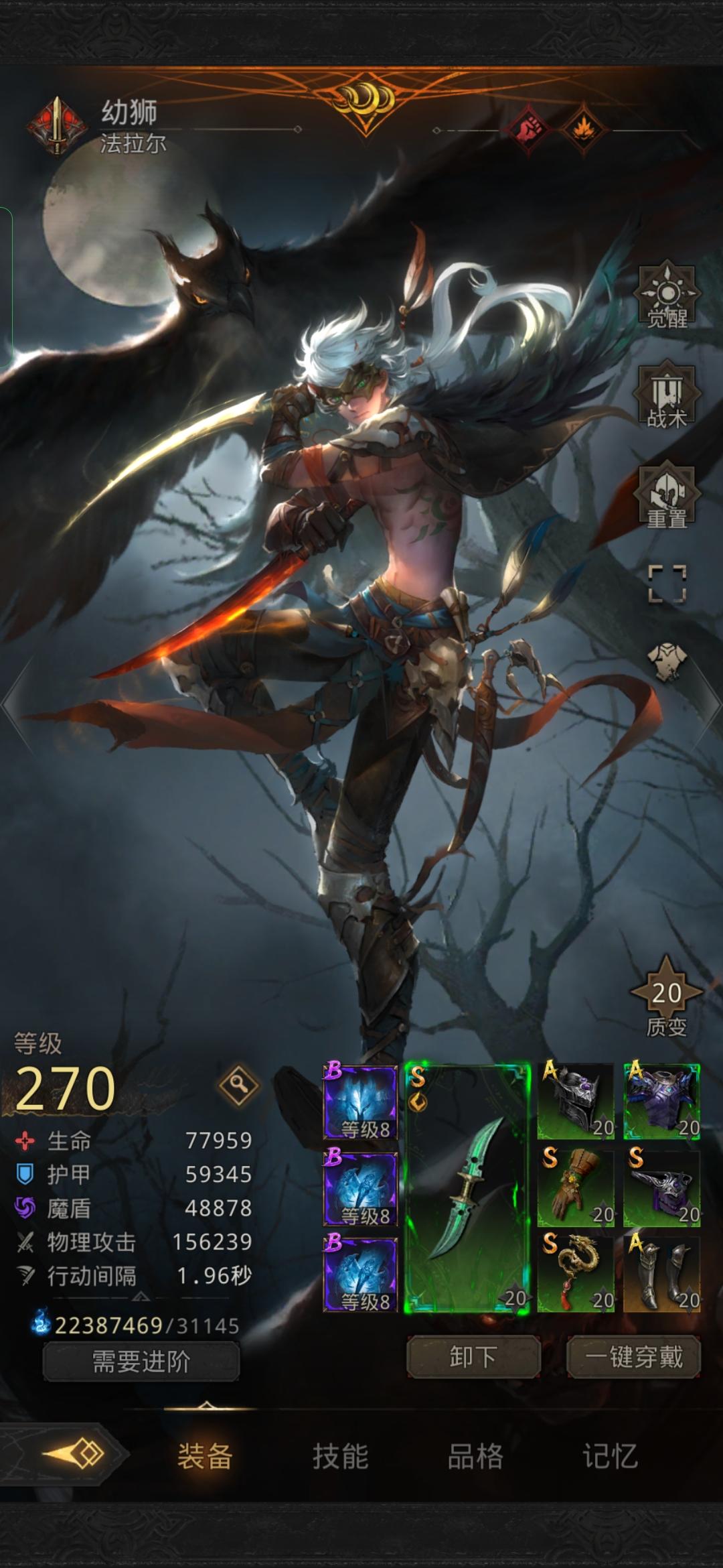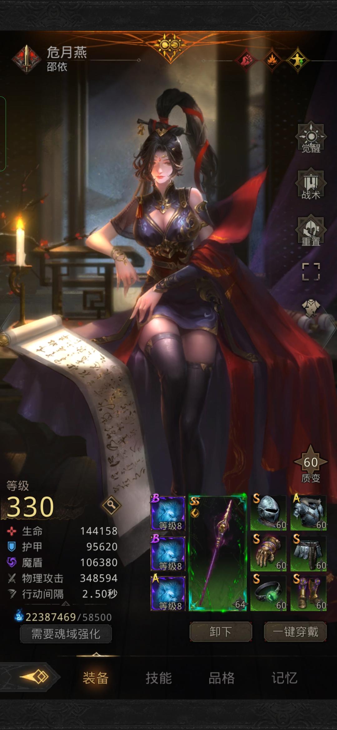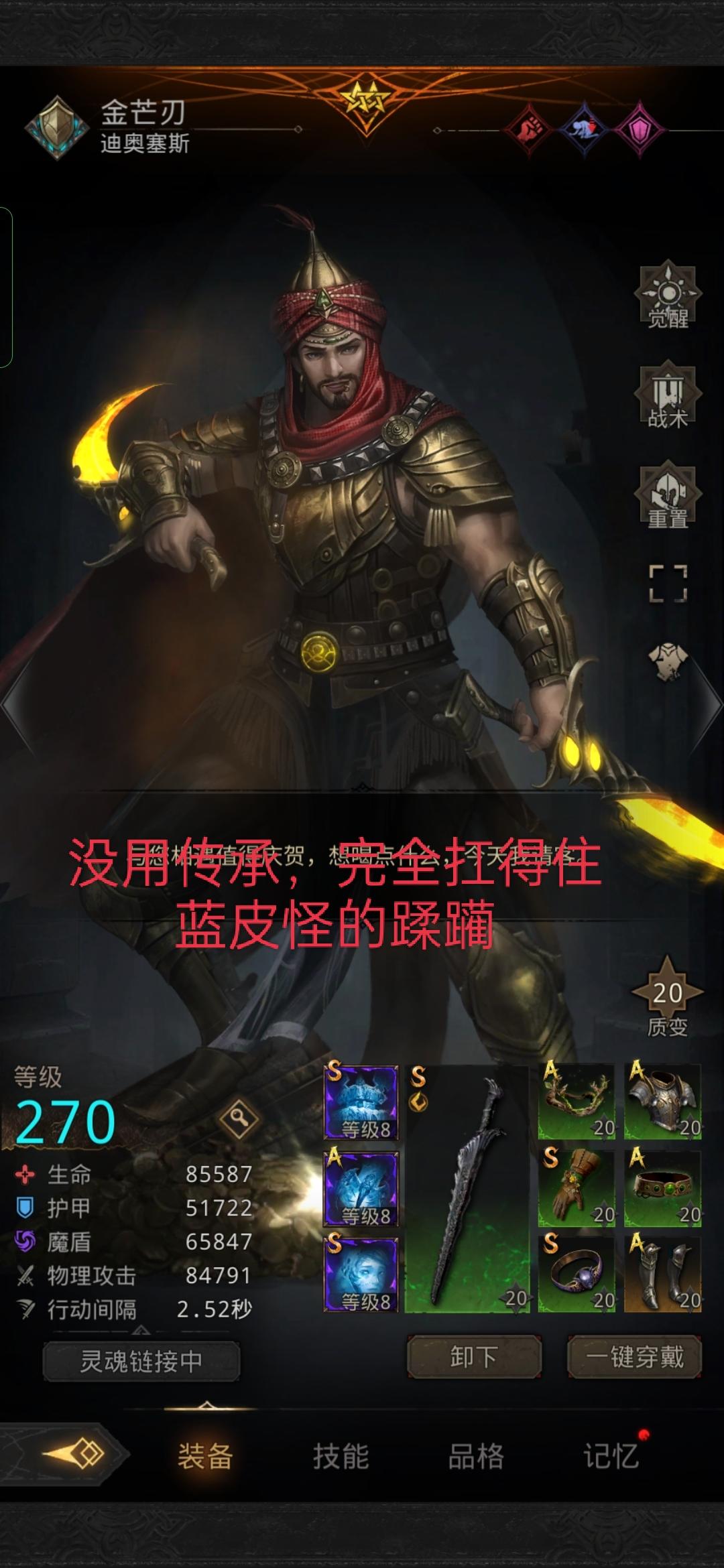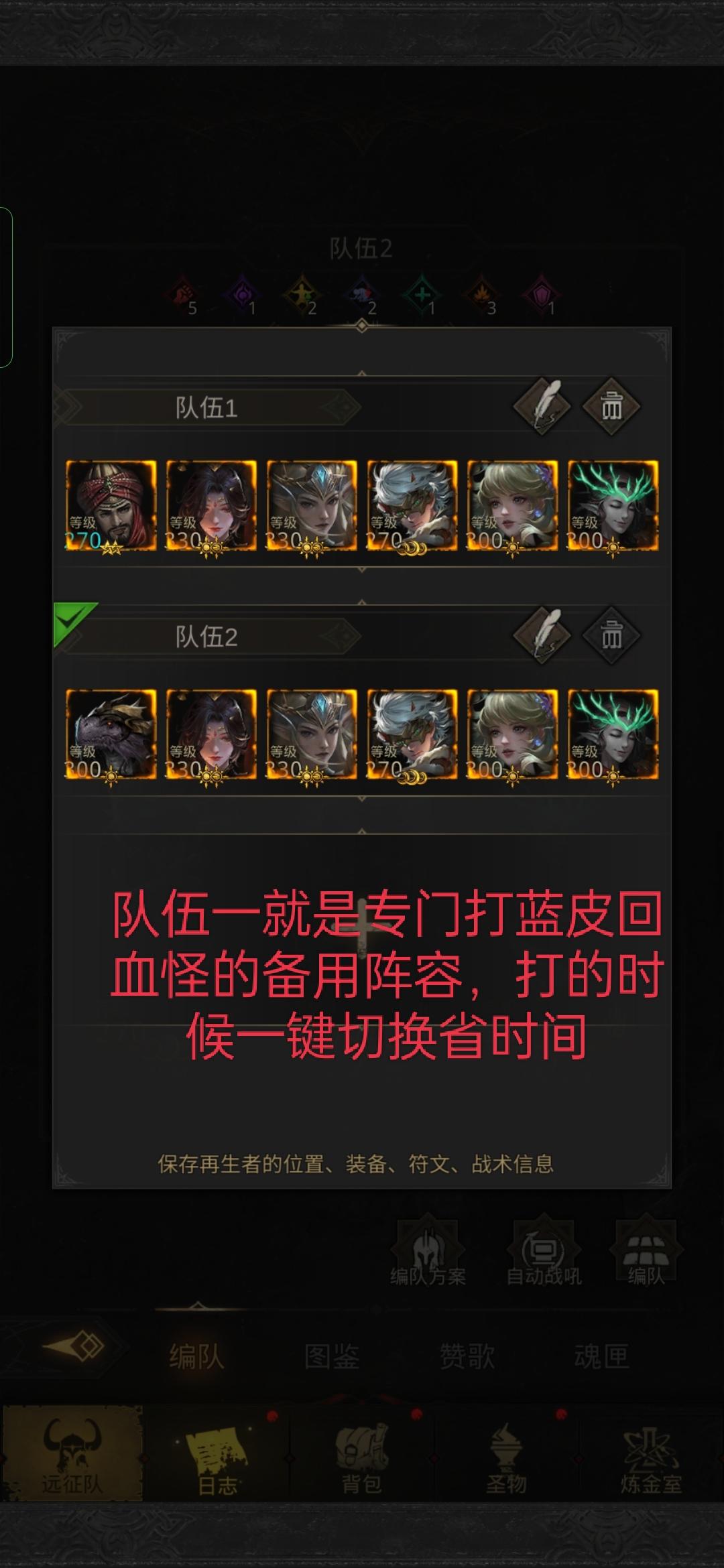 第三个难点就是那个蓝皮回血怪(7),我准备了满减回复的阵容,看图。270级链接,没传承的金邙刃还是能抗住的,注意魔魂和装备,由于下了深渊剑,少了两个豆子,我开局吼了水母吼就挂机到满豆准备秒左边回血的,基本能秒,因为和水母互吼叠减回复buff,它回不上来血,轻松搞定。