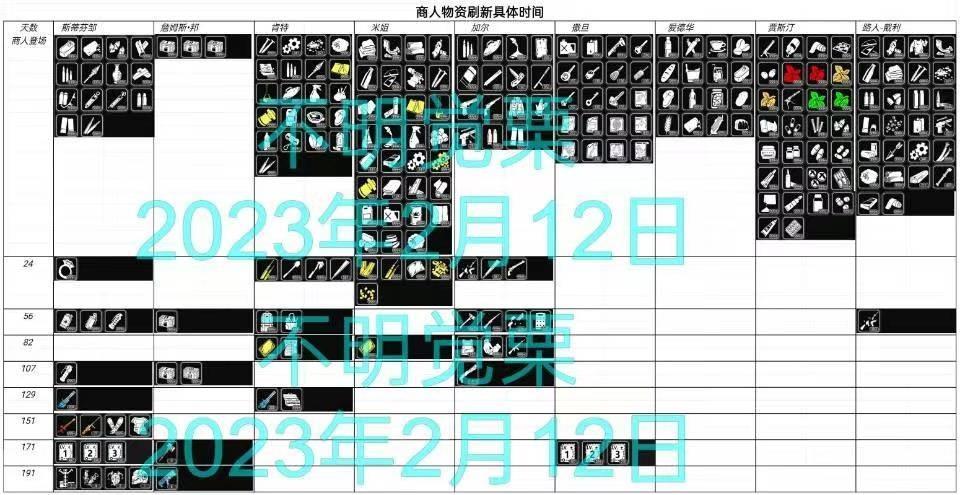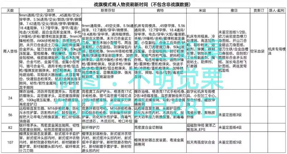 最后再提一些小细节①战旗的体力机制和其他模式不一样,会自动恢复,但是体力条太低会恢复较慢,建议跑几步走几步,时刻保持体力条绿色,以免遇到打不过的怪没体力跑了②遇到手长难拉扯的怪,持盾也顶不住的话还是直接润吧。③如果怪物的攻击dp比较高,拿着不能持盾攻击的武器也可以持盾一下攻击一下。④遇到公园和熊尽量收集一下物资,做一下夏装套和冬装套。⑤其他档寄过来的武士刀只能是合金开刃,不能升级到最后,垃圾货,武士刀每次升级选第一个,碳纤维之前不要开刃!⑥握把升级尽量短升短,不要升空心,没用,长升长的话消耗物资翻倍!!!⑦最后附上来自不明觉栗大佬整理的商人商品更新日子和具体卖的东西。