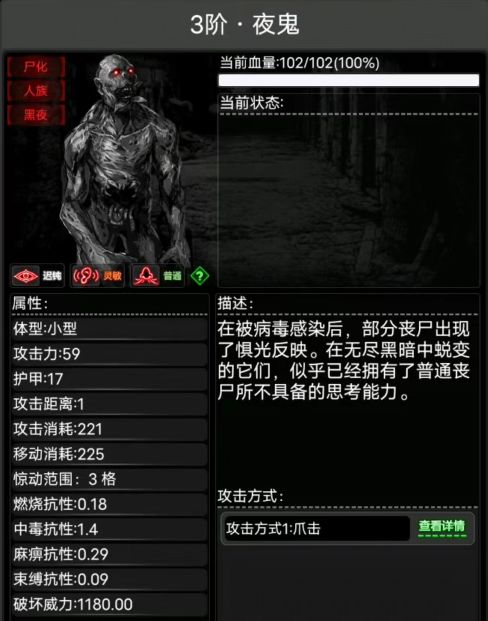 遇到不能一下秒杀,就要开始拉扯了(重点!!!)。触发战斗后,查看怪物攻击和移动消耗。这里就拿新人杀手之一的夜鬼举例。