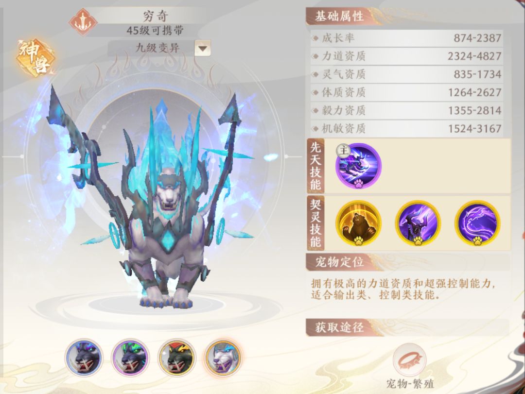 穷奇这个宝宝,咱们就直接对标凤凰好了,因为获取的手段着实不清楚,宝宝的获取途径就只有活动获取这四个大字。不过稀有的程度,并不妨碍我们平民老百姓对他进行窥视。如果内功输出的天花板是蛟龙的话,那么外功输出的天花板就是穷奇了,无论是成长率和力道资质,这货都是领先梼杌的。