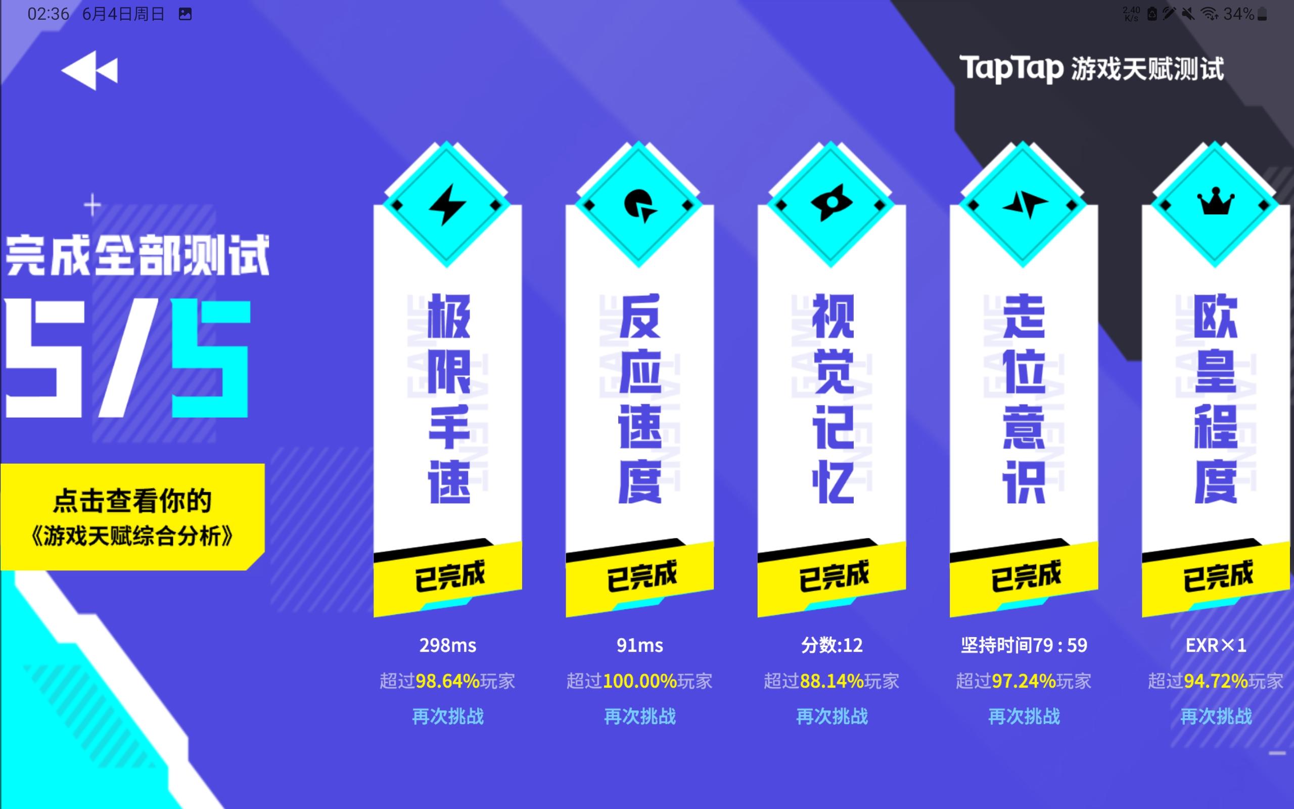 这一关有个 BUG 可以利用一下,在倒计时的时候可以直接点,点了后屏幕会立即变黄,所以我们可以直接左右两只手一起点屏幕,这样我们就能得到一个极小的第一次成绩,之后我们只需要测5次就可以了。当然如果真靠反应肯定不能超越人类极限,所以我们要预判我是每隔一秒就点一次,纯靠运气,每次都能取得一个不错的成绩。
