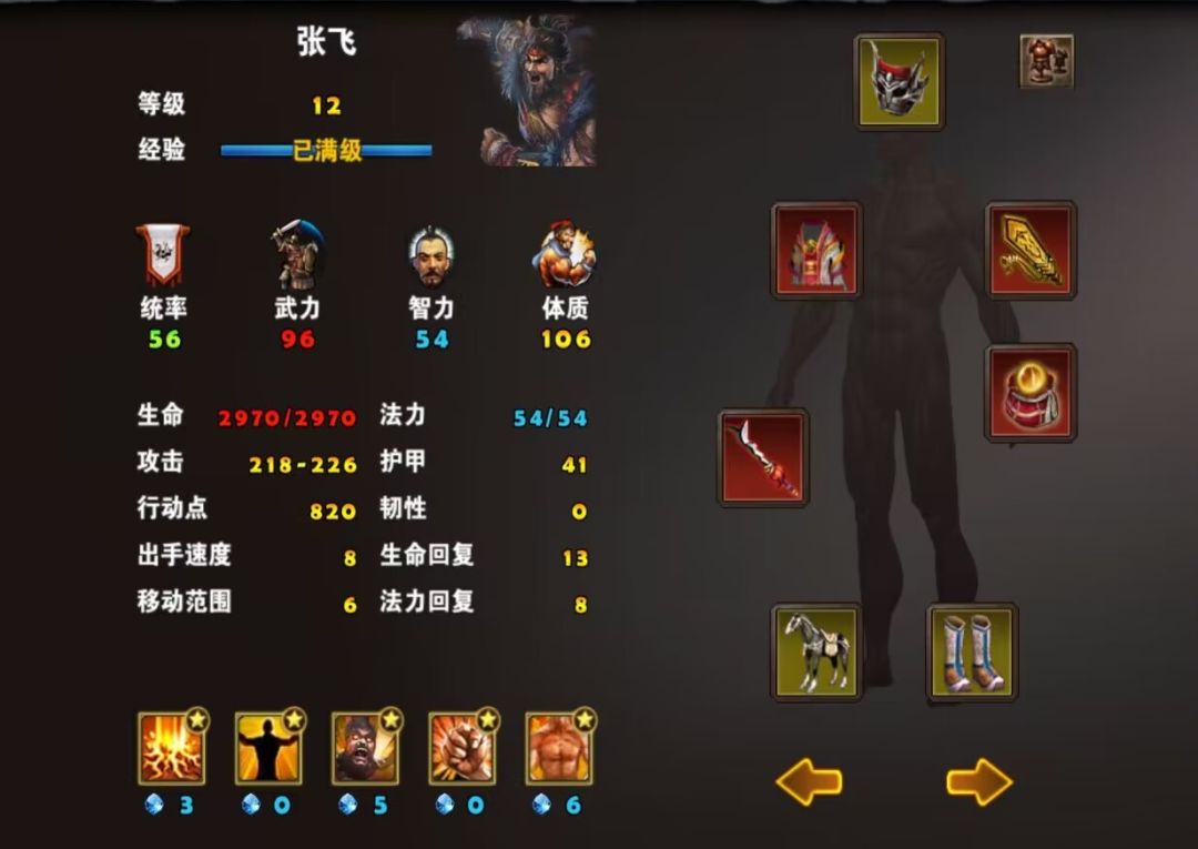 张飞:丈八蛇矛、付完风衣(愤怒甲)、血牙护面、神鹰令、卧龙仙丹(夜明珠)、黑王马、祥云鞋