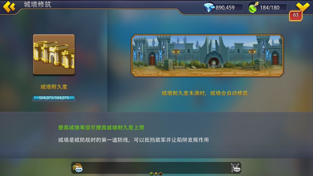 升级城墙等级将提升城墙耐久度。城墙受到伤害会损失耐久度,当城墙耐久度未满城墙损坏时会消耗时间自动修筑或者使用加速道具瞬间修复完成。