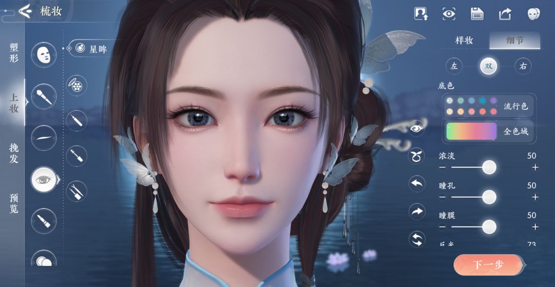 为了能够让大人体验更多更丰富的彩妆,妆容方面我们不光包含了底妆、眉毛、眼影、瞳色和口红等许多品类的基础参数供玩家选择,还可以进行更精细的个性化选择。