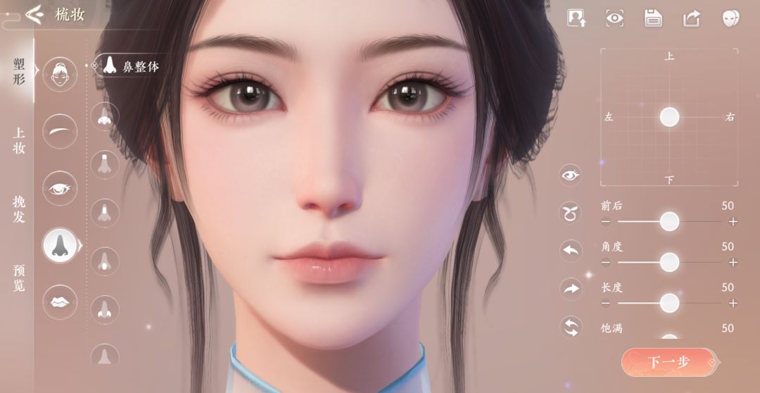 并且额头饱满度、鼻尖高度,甚至眼睛上下眼睑、内外眼角、前中后睫等多种面部参数都可以通过操控摇杆进行立体的自由调节。