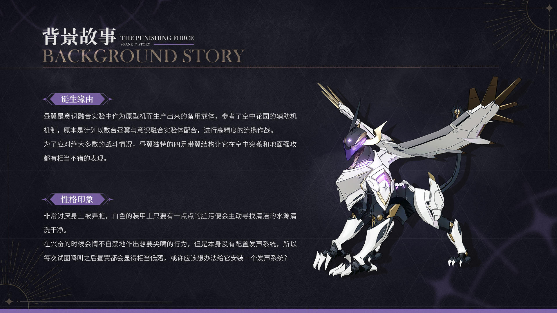 昼翼是意识融合实验中作为原型机而生产出来的备用载体,参考了空中花园的辅助机机制,原本是计划以数台昼翼与意识融合实验体配合,进行高精度的连携作战。