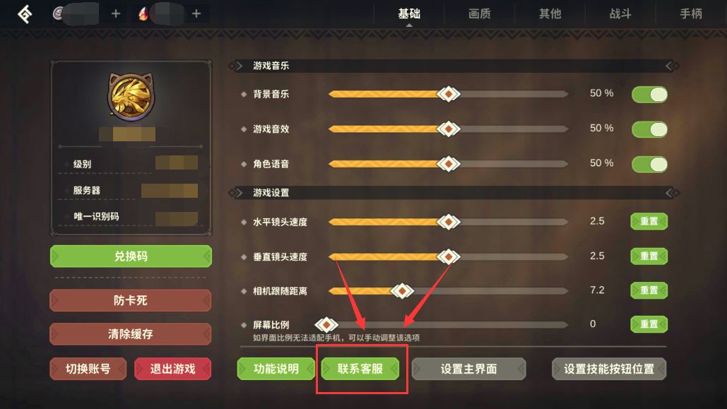 方式二:登录游戏后——点击右上角“齿轮”设置按钮——点击下方“联系客服”按钮——将会跳转至微信即可与在线客服沟通