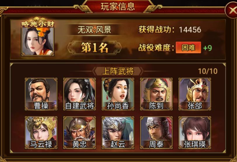 成功荣登本期下邳之战榜首的是 无双·风景 军团,成功攻破 困难+9。