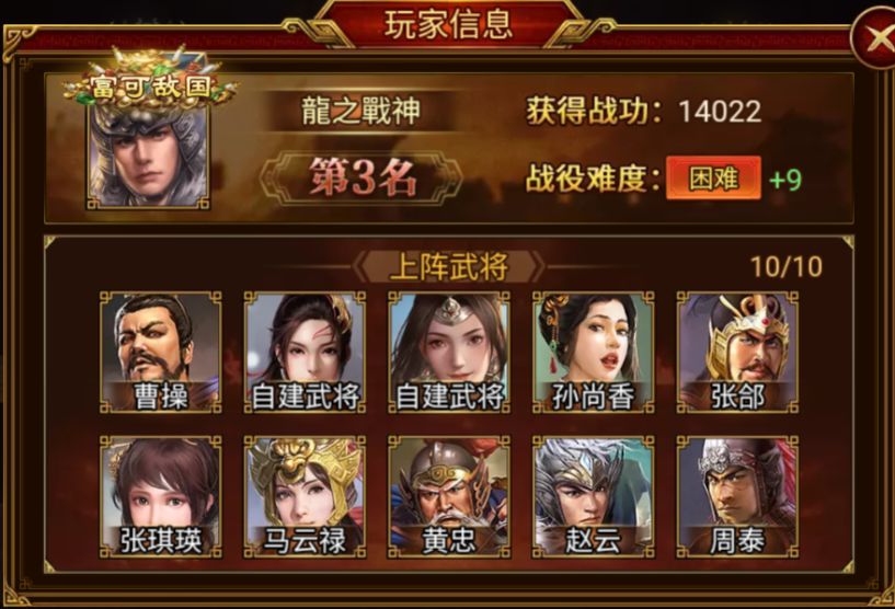 赢得第三位的是 龍之戰神 军团,成功攻破 困难+9。