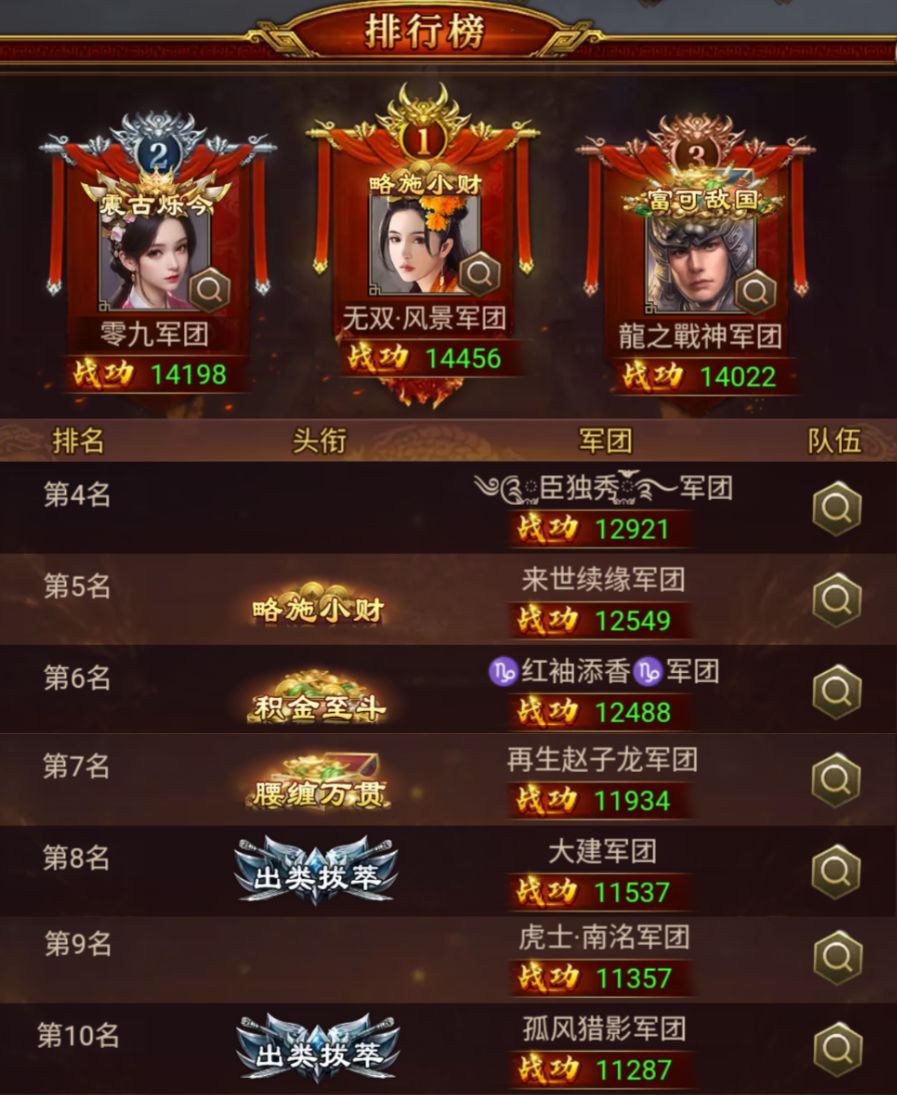 在本期下邳之战中荣登TOP10的勇士们依次是:无双·风景、零九、龍之戰神