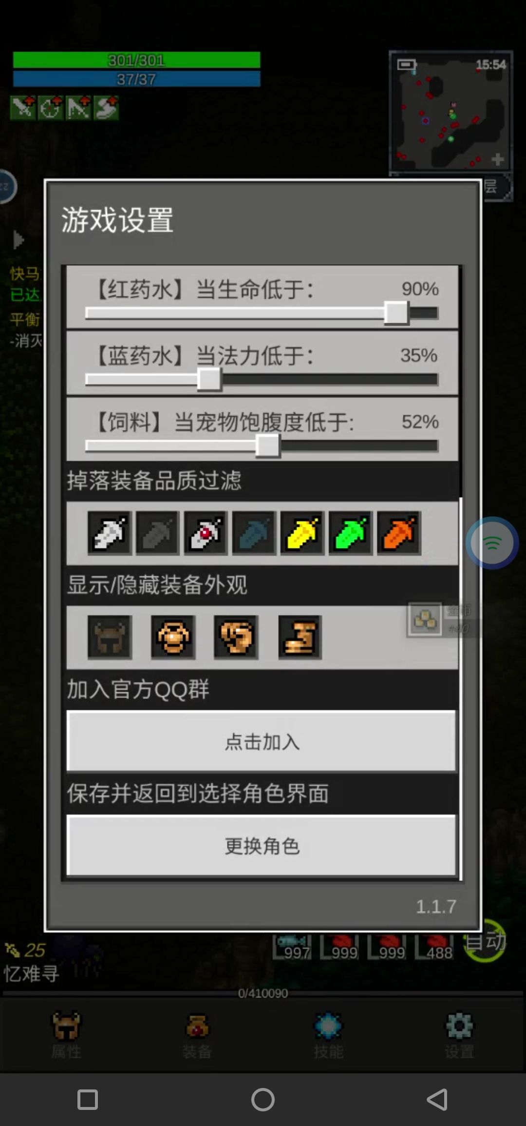 (如图⑥)新手前期的话最好不要屏蔽任何品质的装备(屏蔽装备只需点击一下即可,灰了就是屏蔽成功,再点击一下就可以恢复屏蔽)新手前期非常需要金币,所以不需要屏蔽任何装备,留着出售换取金币。(第一个为破损物装备,这个只要宠物有自动回收功能可以一直不需要屏蔽。第二个为白板装备,当后期金币足够维持的情况下可以关闭,减少回家的次数。第三个为孔装,这个在能有时间看的情况下,必须要打开,可以打出三孔头,三孔头不管前期还是后期都是非常重要的,所以切记不可关闭。第四个蓝装,前期一定要开着,后期如果不缺金币或者粉尘的情况下也是可以关闭的。第五个金装,,第六个绿装,第七个橙装,五六七可以一直开着)最后夜晚挂机的时候,切记除了(一看情况是开还关)五六七,其他的要全部关掉,不然你不想早上起来的时候一背包的垃圾吧。