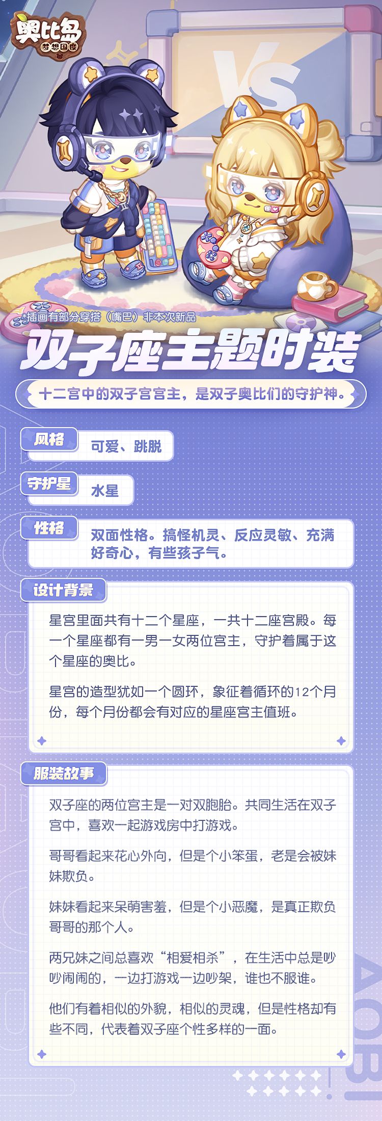 戳开下图,一起来看看奥比生活新系列「双子座织梦套装、双子座幻想套装」的设计展示吧~新系列时装将在6月8日版本开启后上线,小奥比们敬请期待!