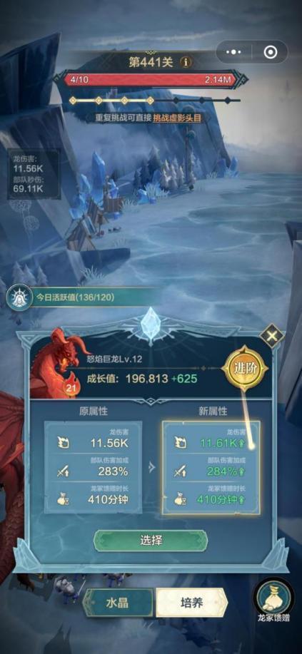 2、推荐每隔一段时间上线收取龙冢馈赠和开启水晶,提早获取古鳞残片,这样可以让红龙加快进阶,配合龙浆果,领主大大的通关进度将会快人一步。