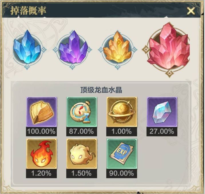 龙血水晶分为六个等级:普通(绿色)、稀有(青色)、珍藏(蓝色)、史诗(紫色)、传说(橙色)、顶级(红色),龙血水晶等级越高,奖励越丰厚。