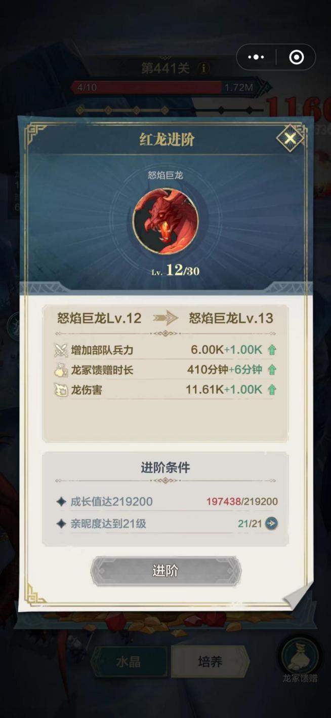 当成长值、亲昵度满足进阶条件时,领主大大可以进阶红龙,提高红龙的等级。进阶后,红龙会增加龙伤害、龙冢馈赠时长、部队兵力,红龙伤害可以让领主大大通关更高的关卡,而部队兵力的增加,则可以帮助领主大大在战斗中更具优势。