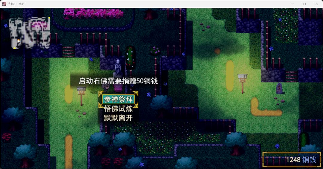 每场BOSS战之前都会看到一尊佛像,参禅祭拜生命魔法怒气全满,同时可以购买补充装备