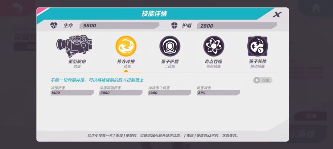 冲撞击飞伤害:1400 (冲撞控制到一个英雄后,然后怼到墙上,刚好撞到另一个英雄会受到这段伤害)伤害减免:21%