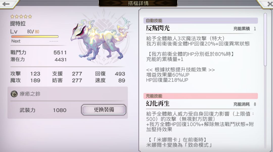 每回合末还拥有治疗、清异常等辅战功效,和米娜尔卡的扣血机制非常搭;