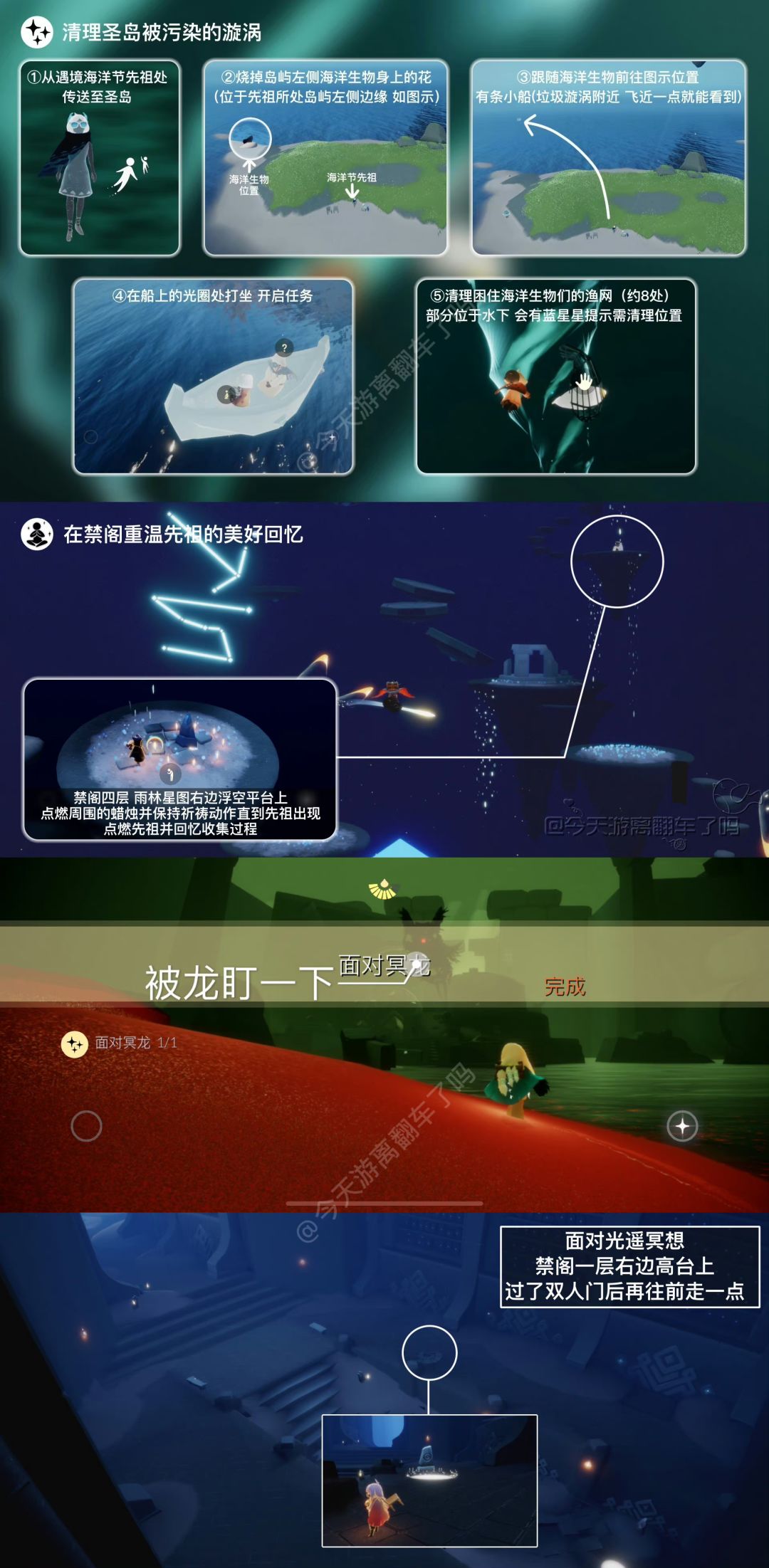 「在禁阁重温先祖的美好回忆」禁阁四层,雨林星图右边浮空平台上。需点燃蜡烛摆出祈祷动作直到中间石碑完全变白,然后重温出现的先祖的收集过程