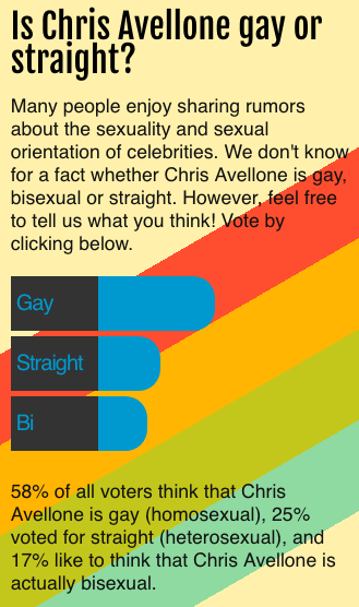 第一点是Chris性格实在是比较包子,从另一个角度讲大概就是这人多少沾点“gay里gay气”。在此前外网的一项关于他性取向的投票里,有近58%的投票者认为他是个同性恋,还有17%的人投给了认为他是双性恋的选项。