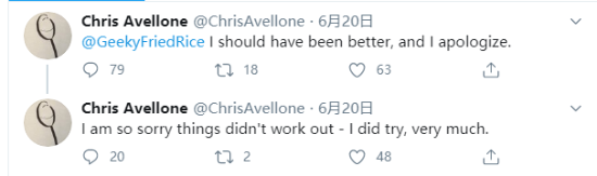 在事件刚开始发酵时,Chris Avellone还以为Karissa的指控是一种“错觉”,他没有承认自己实施了性骚扰,不过还是在第二天发表了一个简单的道歉,说“自己应该做得更好”。