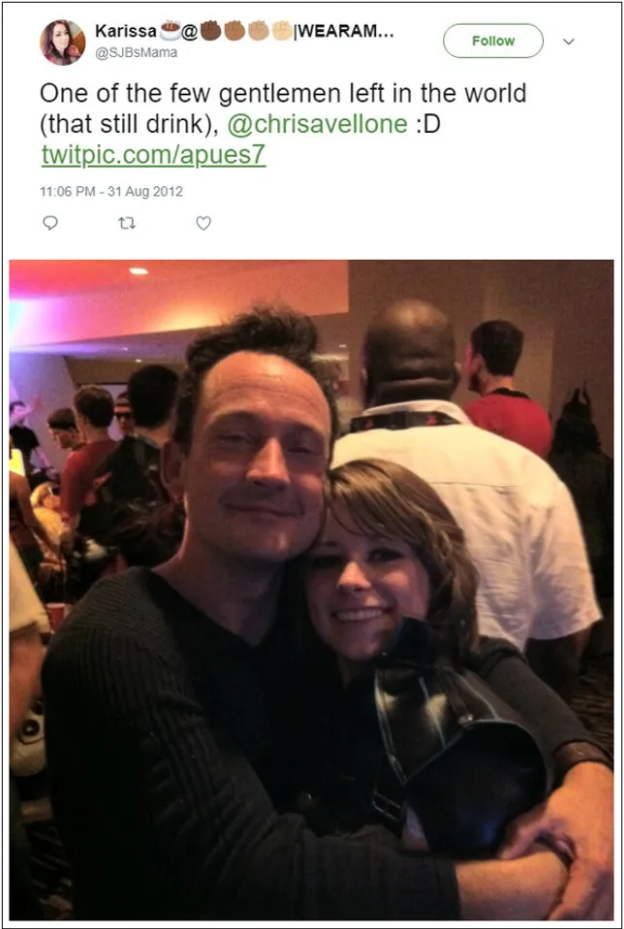 作为Jackie的“好闺蜜”,Karissa并未成功阻止Chris Avellone与Jackie的分道扬镳,这让她变得恼羞成怒了起来。于是便有了在近7年后,Karissa在推特上公开指控Chris试图侵犯自己的那一幕。而那位声称Chris摸了自己屁股的Kelly,也是“闺蜜团”中的一员。