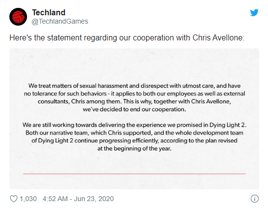 2020年6月18日,IGN发布了一篇关于Chris Avellone谈论RPG游戏开发的访谈。其内容并不重要,重要的是在访谈过后,一名叫Karissa的用户在推特上直接向Chris Avellone开炮:“我对一个花大量时间猎艳年轻女性,将她们灌醉并带去酒店开房的男人毫无兴趣。”