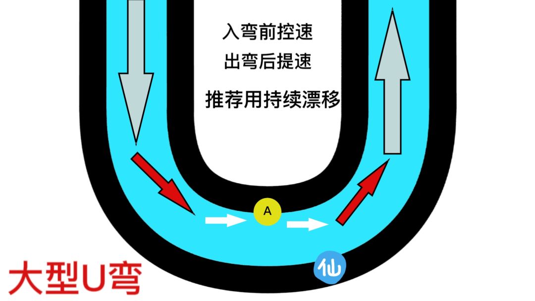 注意事项:大型弯道的过弯速度通常都很快,速度极难拿捏,最常发生的状况就是玩家在弯道中速度过快越跑越偏向外侧,但又舍不得放掉速度,最后不是擦撞外墙就是死撑着勉强撑到出口。但即使撑到出口,事实上对出弯的再加速也早已丧失优势了。
