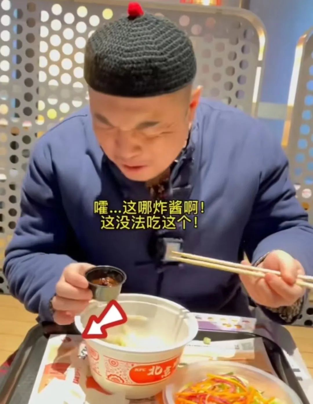 注意看,这个坐在桌前的男人对着刚从柜台前拿过来的肯德基炸酱面一顿猛批,怒斥其颇为寡淡,毫无底线。