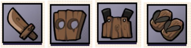 游戏中的装备分了4个部位,分别是武器、头盔、衣服和鞋子。