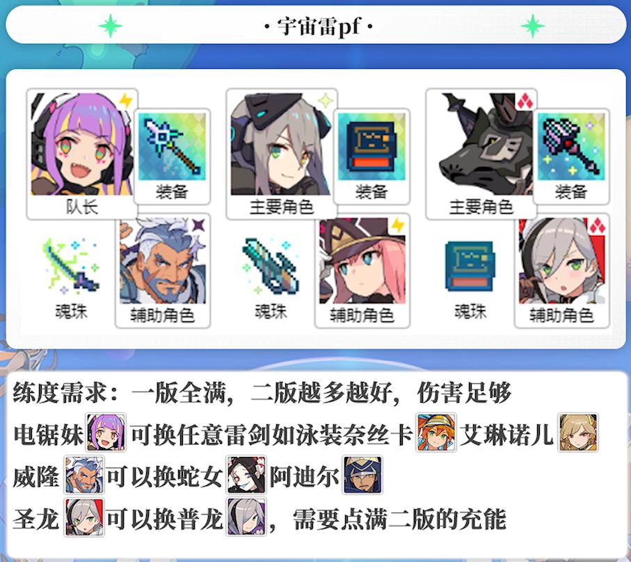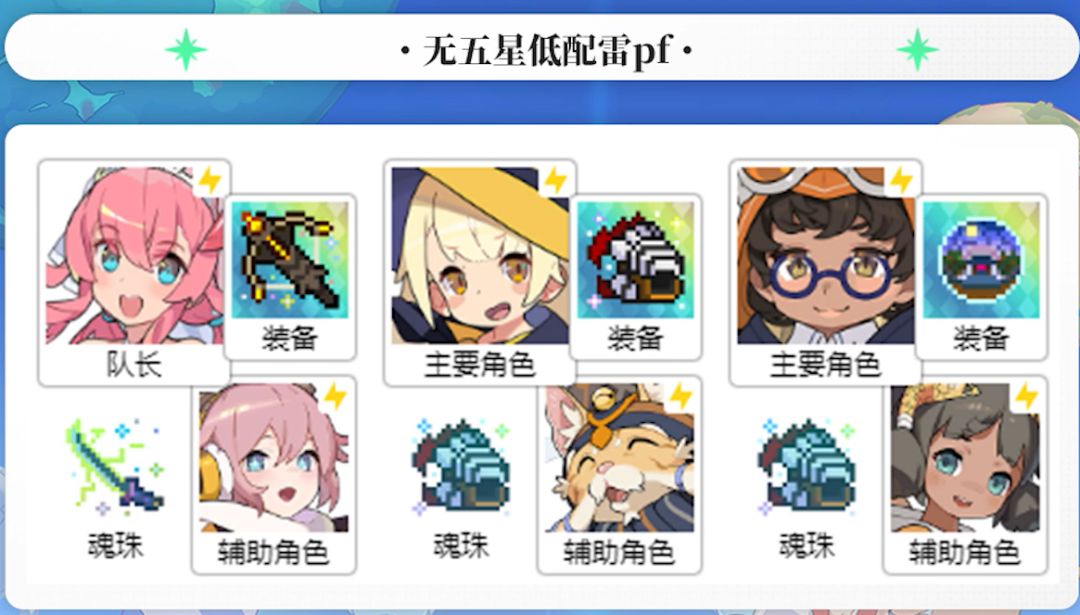 目前雷PF组件稀缺,所以低配乃是下下之策,没法组出宇宙PF的小伙伴不如看看技伤队伍。