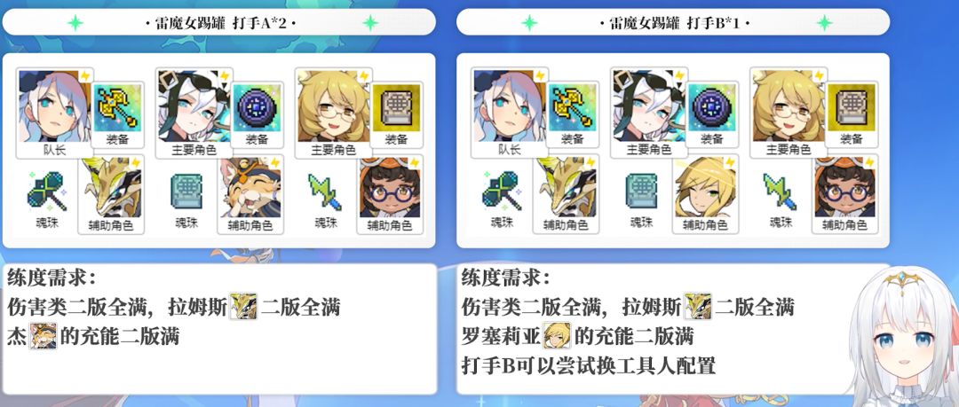 两种配置,如果带工具人的话注意练度不然可能会出现伤害不够的可能。
