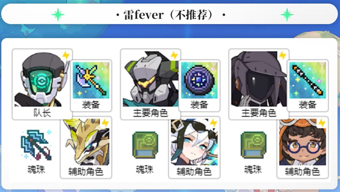 开头也提到过,虽然雷fever的爆发也很高但是本次活动的fever太长了,导致雷fever的爆发门槛极高,是本次活动相当不推荐的队伍构筑,仅推荐前面一个队伍都组不出来的小伙伴考虑。