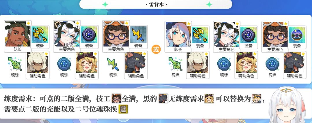 作为当前雷属性的门面,雷背水继续保持着其超高的爆发能力,两种队长的构筑都可以轻松单人通过p1。