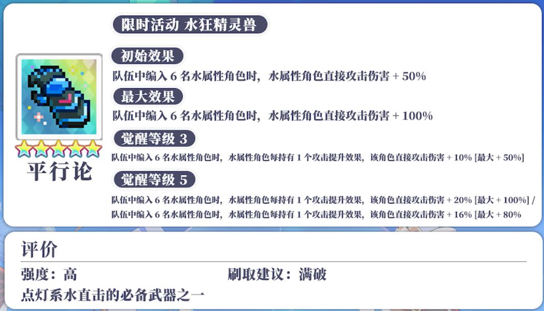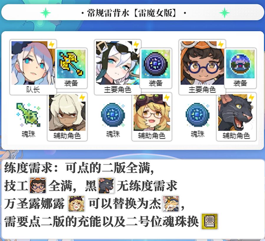 刚入坑的萌新也要注意:由于水属性活动大量雷背水队伍出场,其需要维持低血量获得增益打出更高输出,所以不要携带技能中带有参战回复等字样技能的奶妈角色。