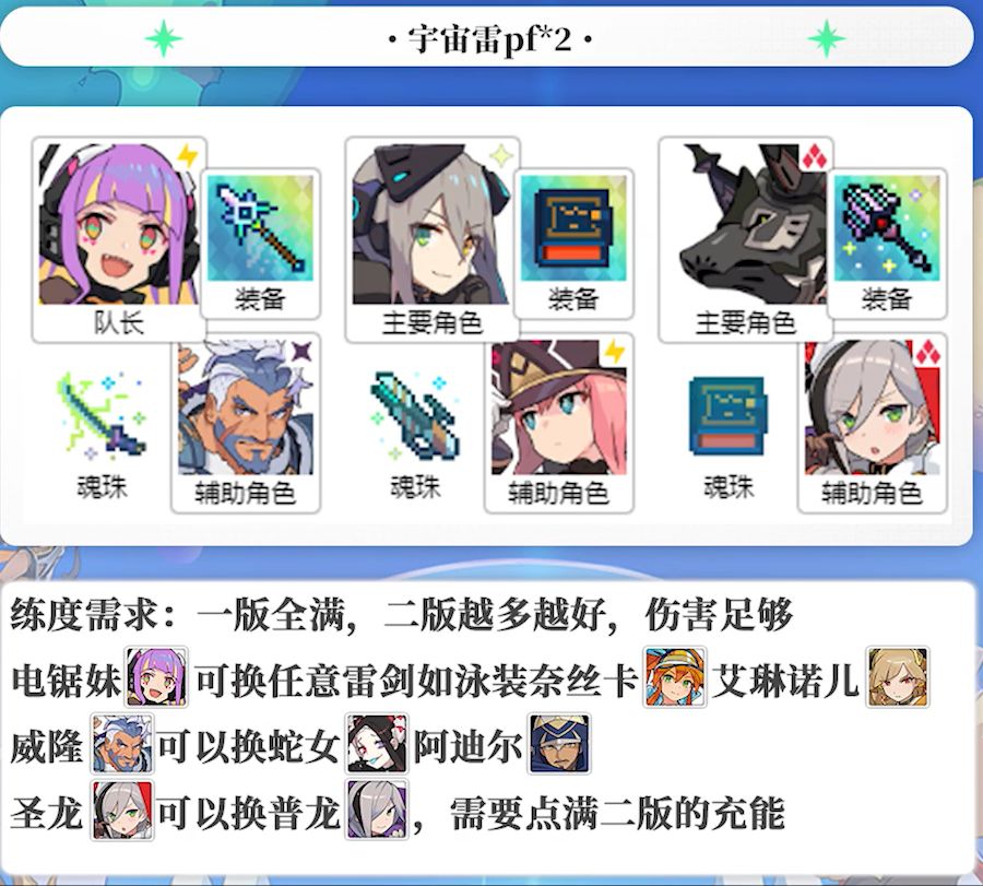 以下雷背水两个都可以选用出一个,宇宙PF队伍出两个即可完成速刷配置