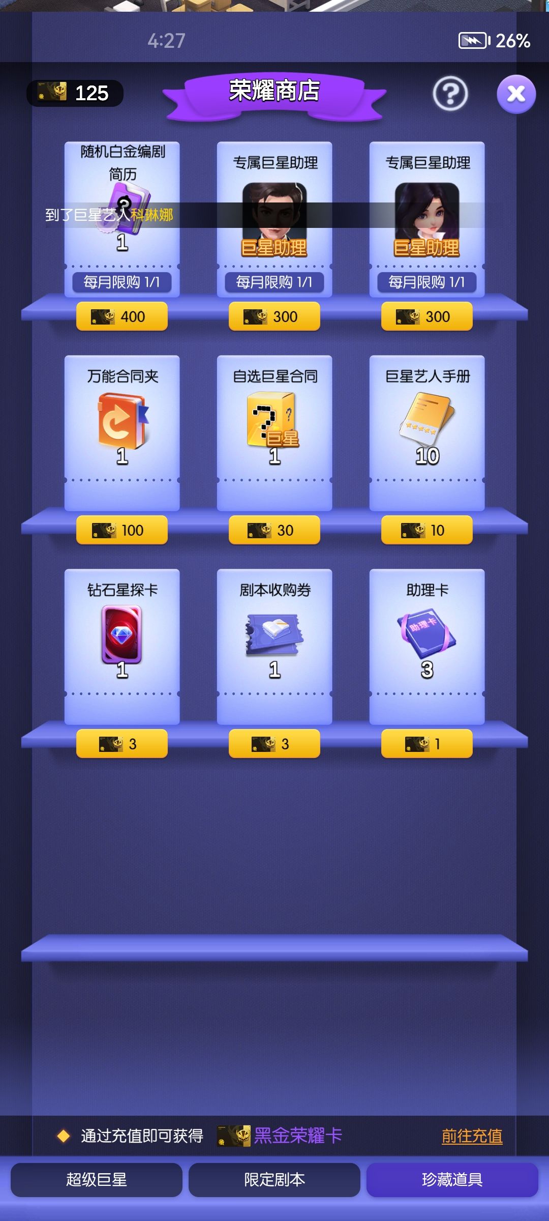 至于黑卡的用处,后续不充钱的朋友可以优先买剧本 专属巨星助理 或许有朋友问为啥买剧本,根据内测 后面升档 要拍摄不同种类的剧本,你没点高星剧本,只有卡档了