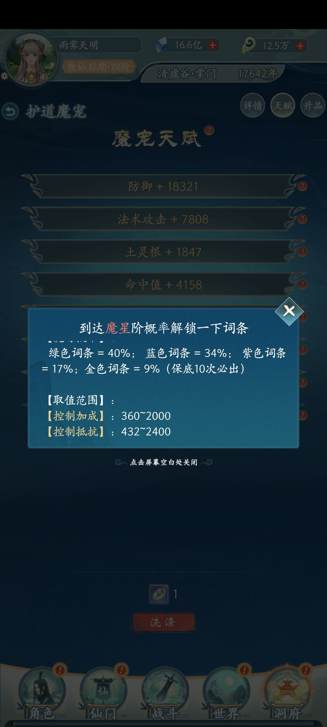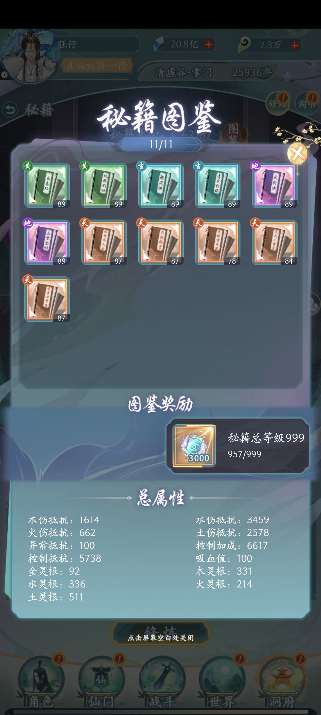 5、肝帝熬时间,氪佬玉开路——秘籍:两本蓝色两本绿色。蓝色参悟理论上限100属性/条绿色分别是60和30。购书凭证主要获取途径——仙盟商店10本/天,每周乱斗积分兑换。控制加成和抵抗各6000左右 。