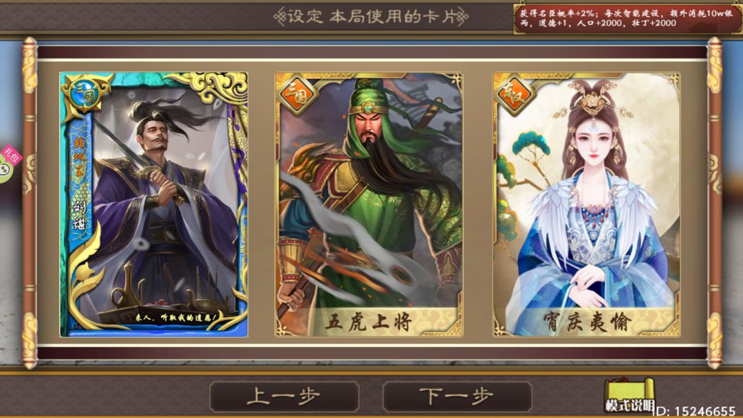 剧情过后第一回合前往睡房,开启丞相辅政,然后选择策卡夭桃秾李,接着点御驾亲征,派个几百民兵站出去,切换回来点朝政要闻,策卡使用完成,然后把部队拉回来,睡觉。
