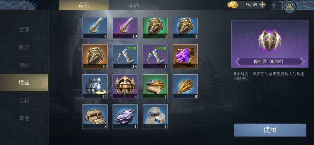 增益道具就很有讲究了,使用的时机可以获得大幅增益效果,作用还是比较强大的,所以建议大家要适时使用,一般来说都是在打团之前用上。当然,保护盾这种就要注意一下,一般是防止复仇的时候来使用了。使用防护盾后,只要自己不主动进攻别人,就可以在保护时间内免于对地方的攻击或者侦查,一般在攻城胜利后,敌方或许会组织集体进攻,或者自己周围有很多敌对领主的时候,避免被进攻或者打飞可以暂时保护一下。再或者想要更换联盟但又没有找到合适的时候,可以适当的保护一下自己。