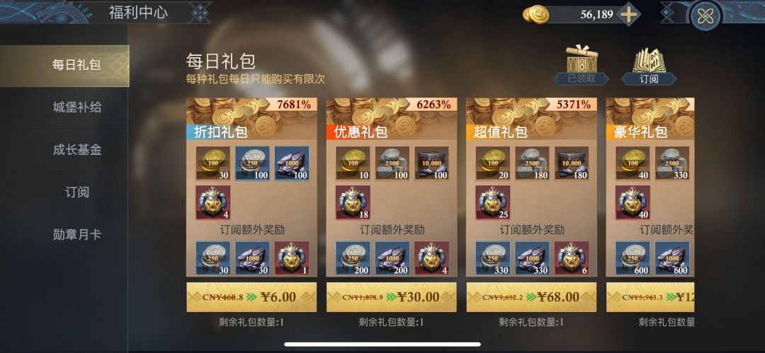 礼包中心的很多道具也是可以关注的,在提升的时候优先礼包,尤其是限时优选,折扣力度更大更划算。