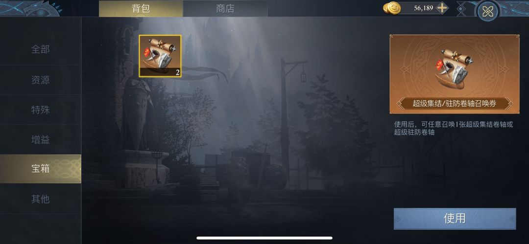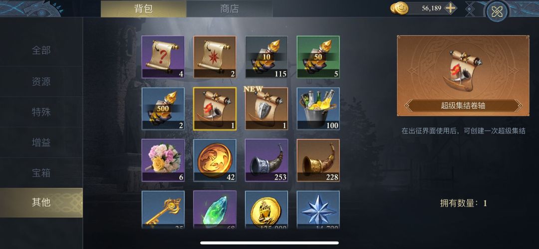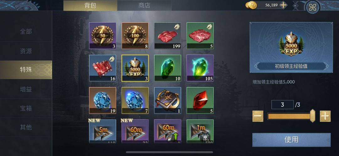 大部分道具还是比较容易理解的,通过道具的名字和描述便可以得之用途,比如提升领主、巨龙经验、技能经验的道具,按照类型来看,可以分为资源类、特殊用途类、增益类、宝箱以及其他。