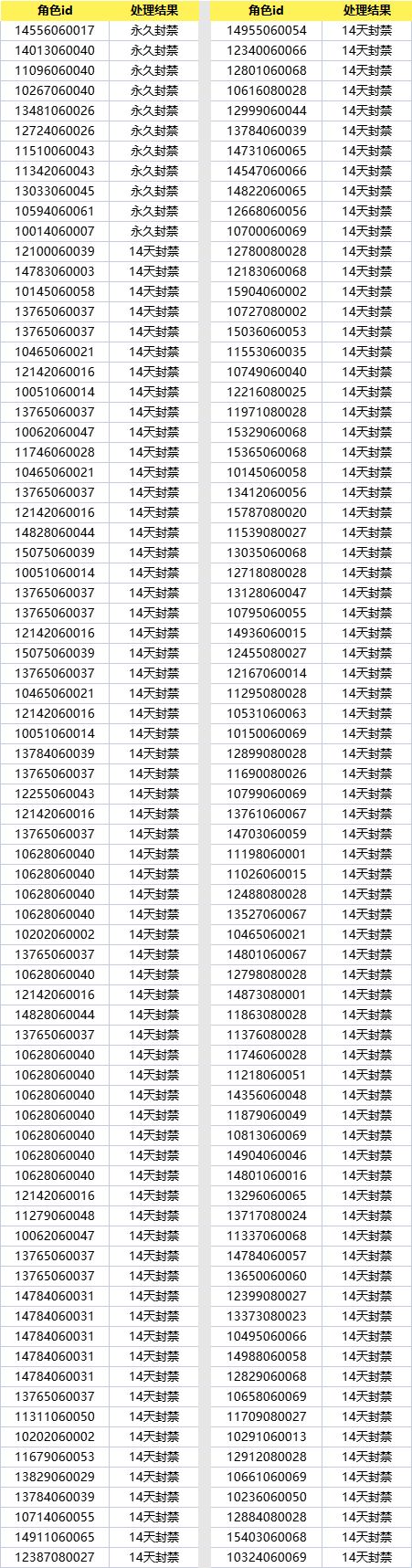 截至6月5日,我们共处罚154个使用外挂账号,以下为处罚名单: