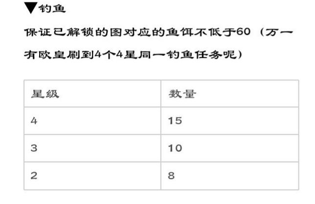 保证已解锁的图对应的鱼饵不低于45(万一有欧皇刷到4个4星同一钓鱼任务呢)